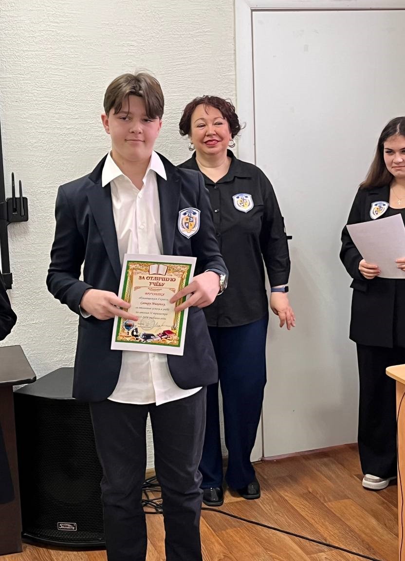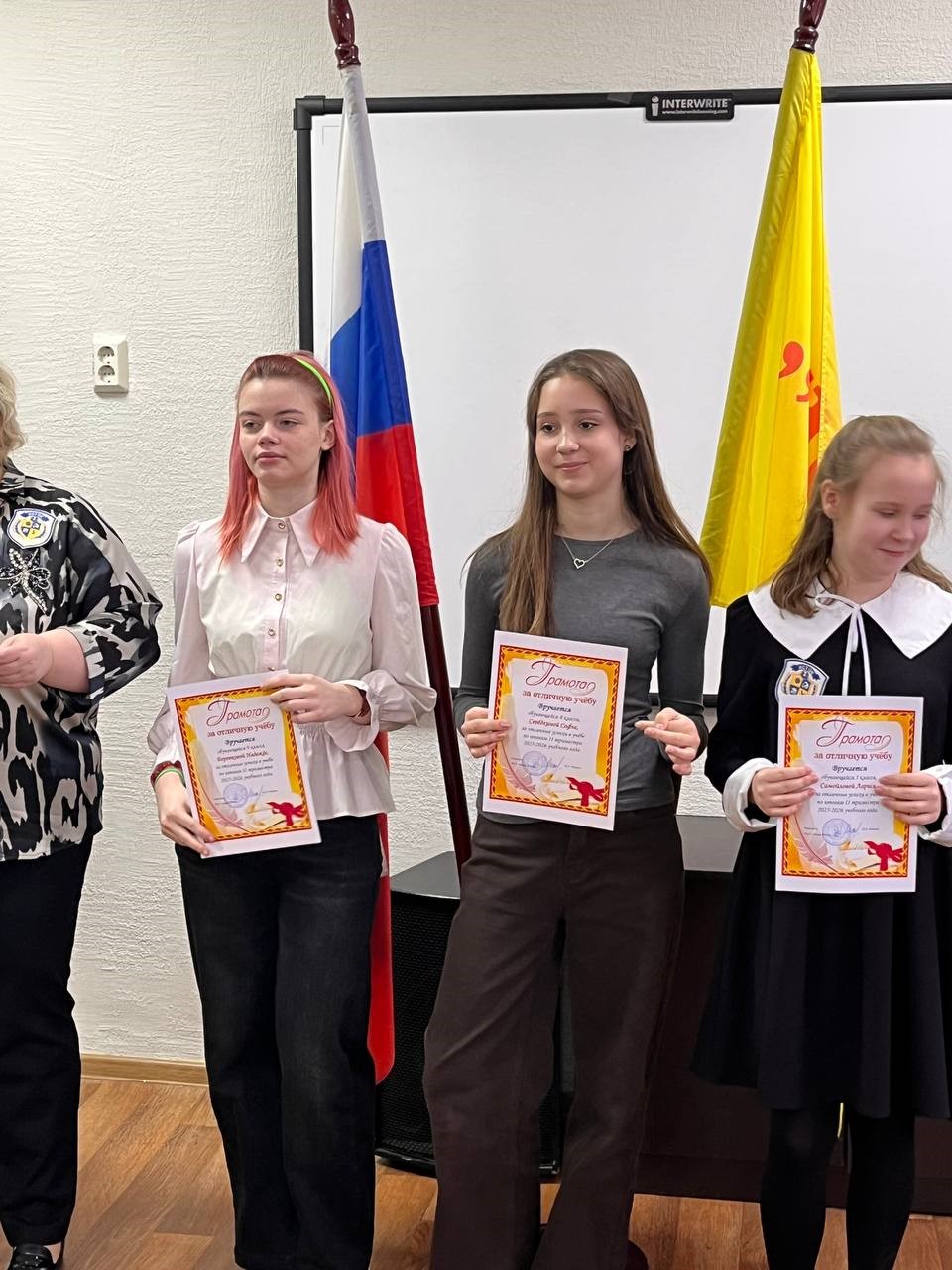 На линейке чествовали победителей и призеров муниципального этапа Всероссийской олимпиады школьников: Валявина Алексея, 11 класс (победитель по информатике, профиль "Информационная безопасность"), Елену Косякину, 9 класс ( победитель по литературе) и Серёдкина Илью, 11 класс (призер по русскому языку). На линейке были также вручены грамоты отличникам в номинации "Гордость школы", активистам в номинации "Активная жизненная позиция". Кроме устоявшихся уже номинаций "Большие надежды" и "Доброе сердце", в этом году появилась номинация "Наставник", в которой были отмечены ученики, успешно помогающие в учебе тем, кто испытывает трудности в изучении материала. В финале мероприятия был показан ролик от телестудии "Оптимизм", где были названы знаковые события триместра.